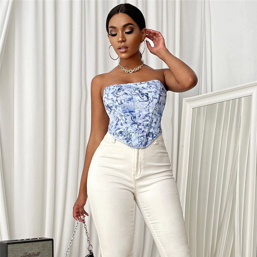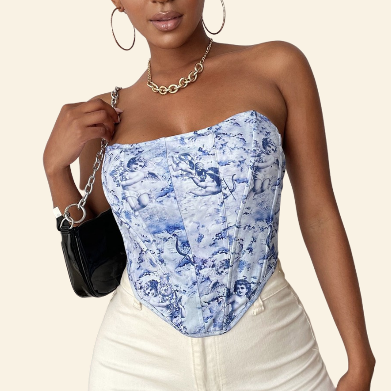 Este corset está bellamente decorado con un estampado vintage. Este Corset Azul Claro añade un hermoso toque de color a tu atuendo.