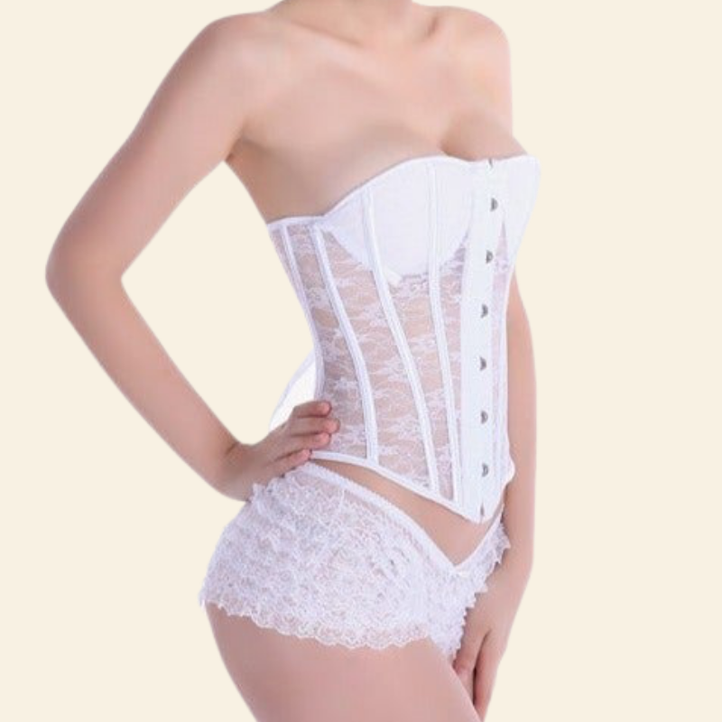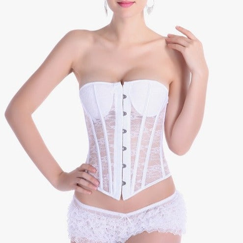 Nuestro Corset Blanco está hecho de encaje Transparente.