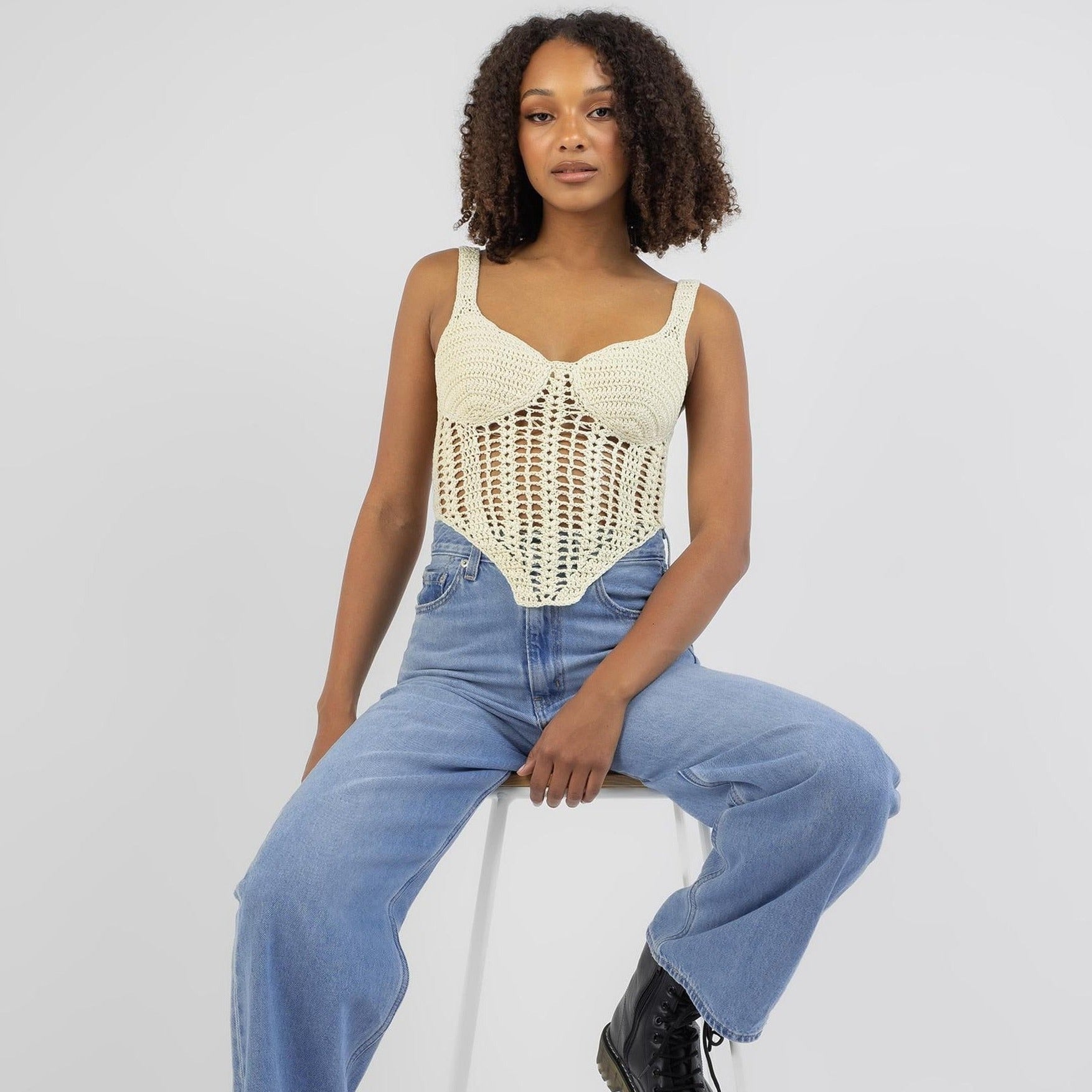 Este Corset Crema es un precioso corset de ganchillo que te dará un look chic y a la última. Inspirado en los corsés, este top veraniego de color crema está diseñado para realzar tu figura y tus curvas femeninas.