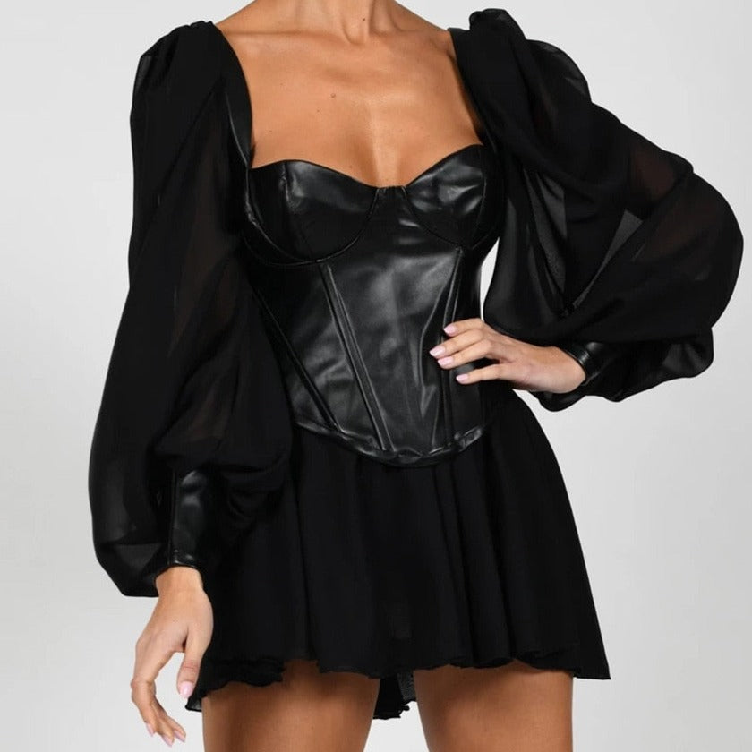 El corset de cuero negro con mangas largas transparentes es una elección atrevida y elegante para cualquier fashionista que quiera causar sensación.