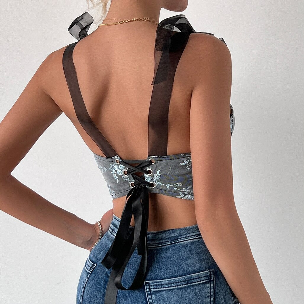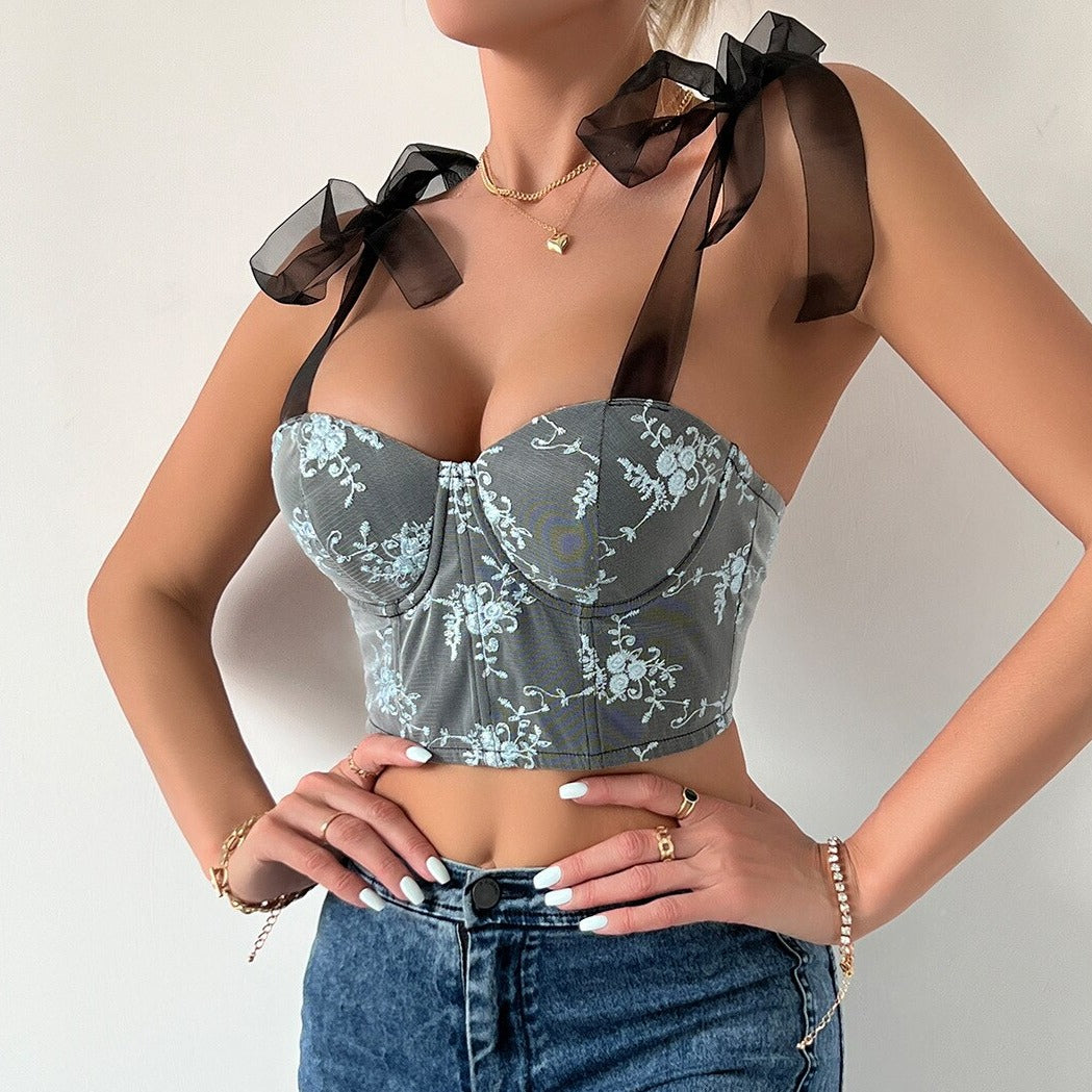 El corset luce un bonito estampado floral que le confiere un aire fresco y femenino. El color azul vintage le da un toque retro que combina a la perfección con el estilo crop top.