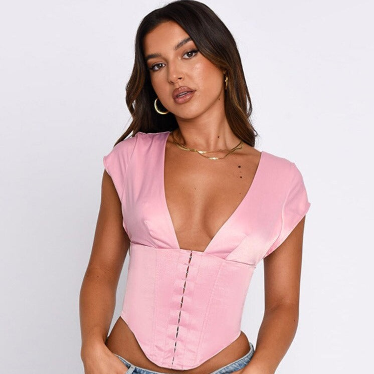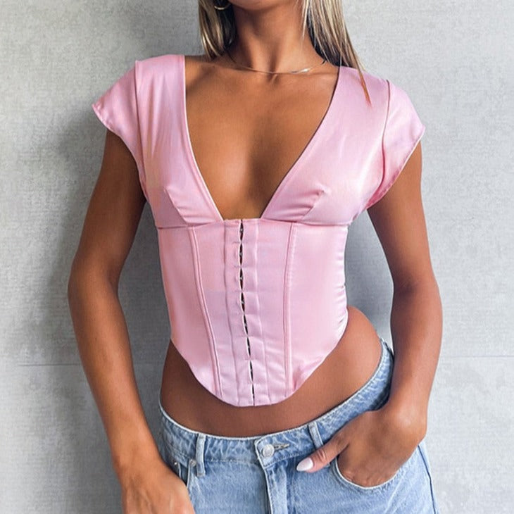 El Corset Fucsia es el complemento perfecto para ocasiones románticas. Fabricado con materiales de alta calidad, este corset es a la vez elegante y cómodo. El escote pronunciado realzará su busto y las mangas cortas darán un toque moderno a su conjunto.